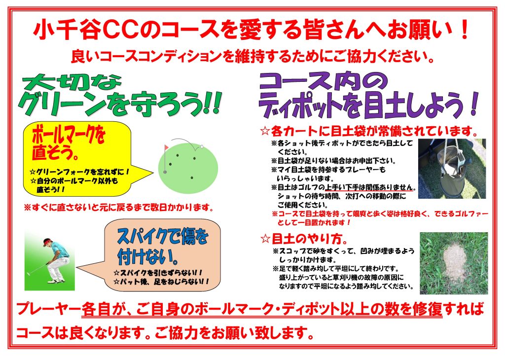 プレーヤーの皆様へお願い 2025年10月8日 最終更新日時 : 2025年10月8日 関 昭雄グリーン上のボールマーク、フェアウェイのディポットが大変多くなっております。ボールマーク、ディポットの修復にご協力ください。